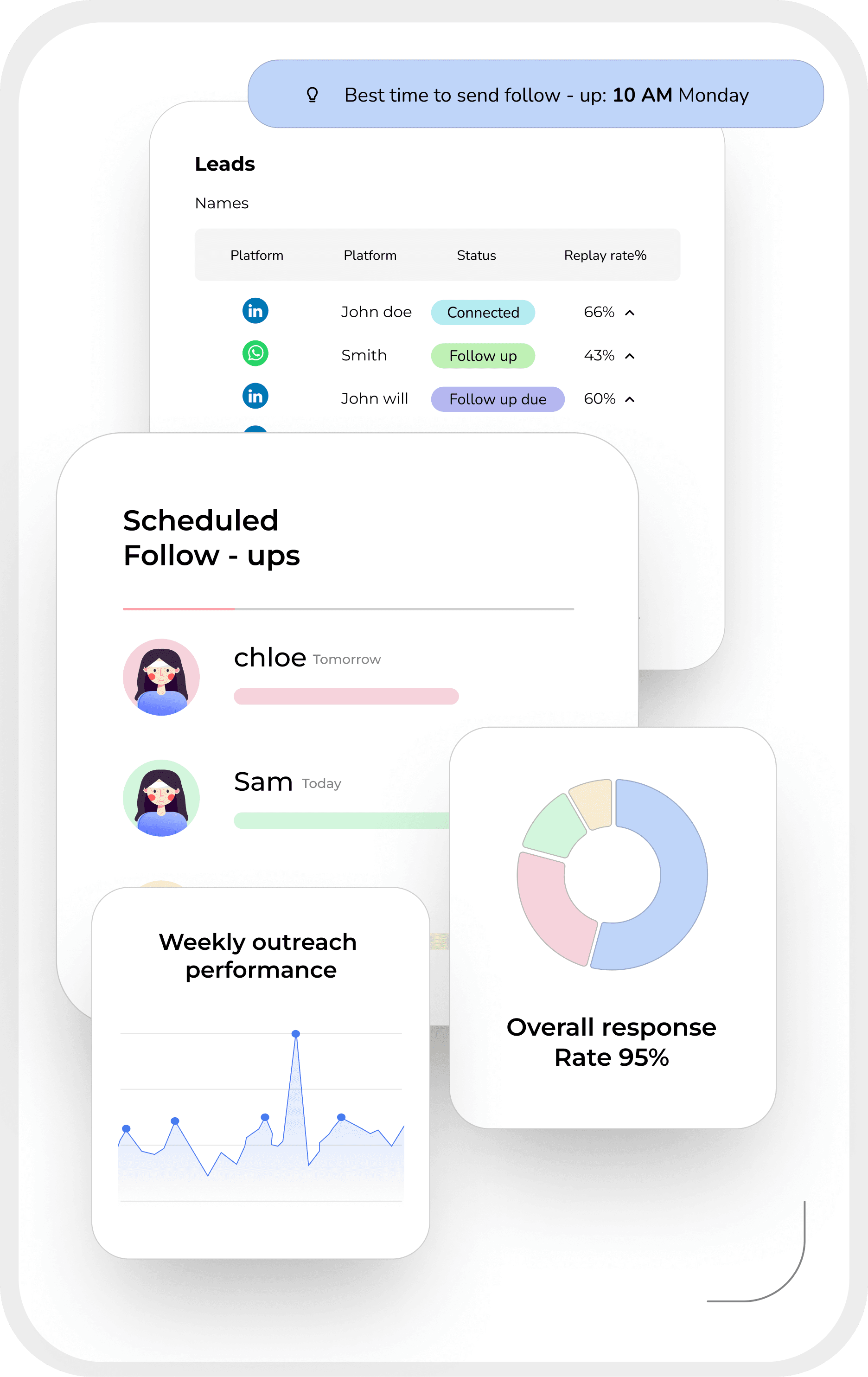 Set your goals, and let our campaign engine suggest sequences, personalize messages, and optimize timing for maximum replies.